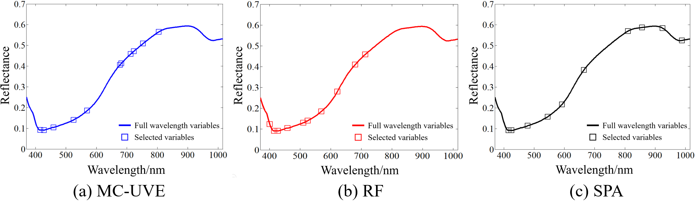 分別采用MC-UVE、RF和SPA方法提取特征波長,如圖4所示?;谶@三種方法提取出的特征波長分別建立PLS-DA和LDA模型,均取得了較好的分類結(jié)果。其中RF-PLS-DA模型表現(xiàn)最好,總的判別準(zhǔn)確率高達(dá)92.86%,健康、凍死、病害三類分別的判別準(zhǔn)確率為97.14%,94.29%和87.14%。LDA分類模型的預(yù)測結(jié)果,以三維散點圖的形式呈現(xiàn)在圖5中。