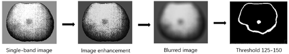 圖3顯示了隨機(jī)選擇樣本的單波段圖像處理流程。最后,對(duì)形態(tài)學(xué)處理后的圖像選擇合適的閾值分割出特征區(qū)域,并用于掩模處理。