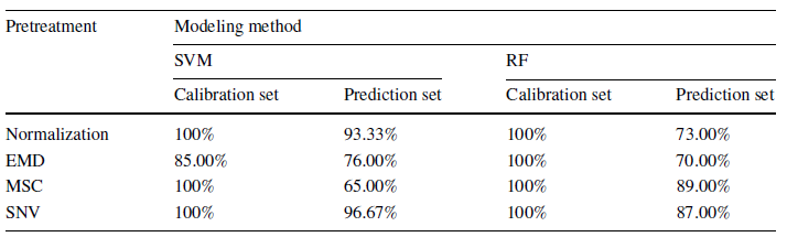 表1表示了SVM和RF模型用于區(qū)分72小時(shí)后挫傷的樣本的不同挫傷水平的準(zhǔn)確性。從表1中可以看出,當(dāng)選擇歸一化、EMD和SNV的預(yù)處理方法時(shí),SVM模型在預(yù)測(cè)集中的結(jié)果明顯好于RF模型的結(jié)果。字母a至c表示三個(gè)瘀傷級(jí)別:輕微和嚴(yán)重,對(duì)應(yīng)于A組至C組。圖4a顯示了不同損傷程度的樣品在損傷后不同時(shí)間熒光光譜的變化。從圖4a可以看出,在520nm和680nm附近有兩個(gè)明顯的尖峰。圖4b和圖4c是在520nm處的放大圖像,680 nm波長(zhǎng)處。500-600 nm的波形代表核黃素、多酚和黃酮類化合物的合成反應(yīng)。與表皮組織相比,水果中的黃酮類化合物存在于較深的表層,這是由于它們與角蛋白的結(jié)合相對(duì)較慢,因此熒光響應(yīng)值較小。葉綠素吸收350-500 nm和600-700 nm兩個(gè)波段的光,并在680 nm和740 nm發(fā)射。680 nm附近的熒光峰應(yīng)為葉綠素吸收峰。從圖4中可以看出,兩個(gè)峰值處的熒光信號(hào)強(qiáng)度隨著瘀傷程度的增加而變?nèi)?。外界損傷造成表皮組織細(xì)胞壁破裂,破壞了冠梨內(nèi)部成分,導(dǎo)致胡蘿卜素和葉綠素含量逐漸降低,熒光強(qiáng)度相應(yīng)逐漸減弱。另外,在圖4b中發(fā)現(xiàn),C組挫傷樣本的熒光光譜在520 nm處的峰值處熒光強(qiáng)度較低。推測(cè)在樣品被挫傷后的第一天內(nèi)類黃酮在很大程度上損失。