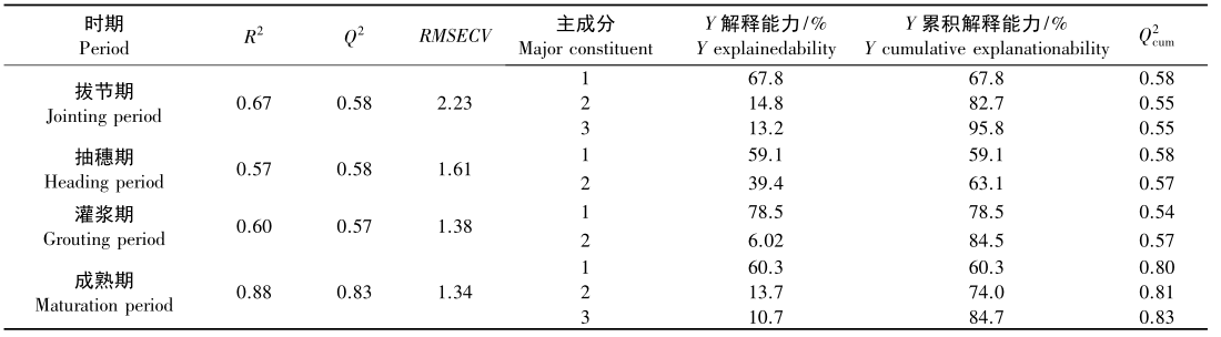 基于高相關(guān)的光譜特征參數(shù)NDVI、GNDVI、PSNDa、PSSRc、RENDVI及Dy構(gòu)建了谷子葉片葉綠素含量PLSR預(yù)測(cè)模型(表5)。PLSR模型的Q2均高于0.56,對(duì)因變量的解釋程度一般,R2均在0.6以上,而預(yù)測(cè)集的R2在0.55~0.71之間,其RMSECV在1.41~2.66之間。在拔節(jié)期,PLSR模型的第一主成分對(duì)葉綠素變化的解釋能力為67.8%,加入第二、三主成分解釋能力增加到82.7%、95.8%;抽穗期、灌漿期和成熟期PLSR模型對(duì)葉綠素的總解釋能力分別為63.1%、84.5%和84.7%。PLSR預(yù)測(cè)模型精度整體上是優(yōu)于單變量模型的。
