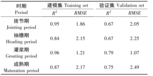 表6列出了基于6個(gè)光譜參數(shù)構(gòu)建的BP神經(jīng)模型精度。從建模集來看,4個(gè)時(shí)期的模型決定系數(shù)均大于0.84,模型的穩(wěn)定性較高,其中模型在灌漿期達(dá)到最佳估測(cè)精度,建模集R2達(dá)到了0.96,而RMSE最低,說明該時(shí)期的模型穩(wěn)定性和預(yù)測(cè)能力較好。從圖2可以看出,相比于傳統(tǒng)的一元模型,利用BP神經(jīng)網(wǎng)絡(luò)對(duì)谷子葉片的SPAD值估測(cè)具有較高的精度,4個(gè)時(shí)期的預(yù)測(cè)精度均在0.66以上。綜合比較,相較于偏最小二乘回歸模型與一元線性模型,利用BP神經(jīng)網(wǎng)絡(luò)建模效果最佳。