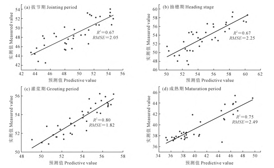 如表3所示,在不同生育期,分別基于一次線性、二次非線性、指數(shù)及對(duì)數(shù)形式構(gòu)建各因子與葉綠素含量的對(duì)應(yīng)關(guān)系。在拔節(jié)期和抽穗期NDVI與葉綠素含量有較好的對(duì)應(yīng)關(guān)系(R2 > 0.52),估算值也具有最小的殘差(RMSE < 2.28)。在灌漿期和成熟期,RENDVI、PSSRc則分別對(duì)葉綠素含量估算有較好的適用性。其中,NDVI的二次非線性、一次線性模型分別在拔節(jié)期和抽穗期表現(xiàn)良好;RENDVI、PSSRc則分別以一次線性及指數(shù)形式出現(xiàn)在灌漿期和成熟期。