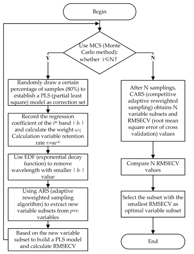 由于光照條件、空氣濕度和光譜采集儀器等干擾因素,土壤反射率光譜容易受到噪聲的影響。為了平滑波形,提高信噪比,本研究采用離散小波變換(Discrete wavelet transform, DWT)算法進行去噪。為了選擇較少的波段作為回歸方程的自變量,本研究采用CARS-SPA算法。圖1展示了CARS算法的基本流程。
