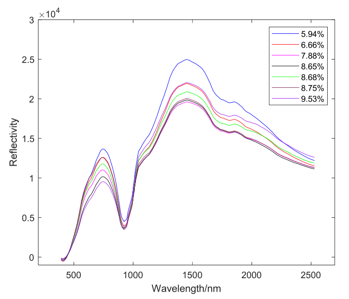 圖3展示了部分采集到的SMC及其對應的反射率曲線。從圖3可以看出如下規(guī)律:(1)光譜反射率值在380 ~ 1000 nm和1000 ~ 2530 nm波段呈先升后降的趨勢,即在這兩個波段處存在反射峰。此外,在近紅外波段1000 ~ 1350 nm存在一個吸收谷。(2)在380 ~ 1000 nm范圍內(nèi),光譜反射率隨SMC的增加而逐漸減小。但在1000 ~ 2530 nm范圍,這一規(guī)律不明顯。SMC差異較大的光譜曲線一般符合光譜隨SMC增大而減小的規(guī)律。