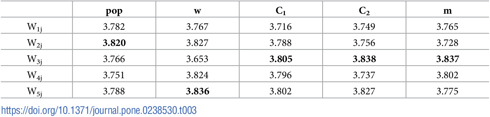 每一列表明了一個參數(shù)對預測精度的影響。例如,在第一列中,對于i = 1,... ,5,Wi1之間的差異揭示了種群大小如何影響反演模型的準確性,而與其他參數(shù)的值無關。由于W21 ≥ Wi1,我們得出結論,最大化R2的種群大小應該是正交陣列中的第二個值,也就是pop = 50。同樣,對應于w、C1、C2和m的列分別在W52、W33、W34和W35處最大化。因此,參數(shù)的最佳值是pop = 50,w = 0.9 ~ 0.3,C1 = 1.65,C2 = 2.8和 m = 0.2。