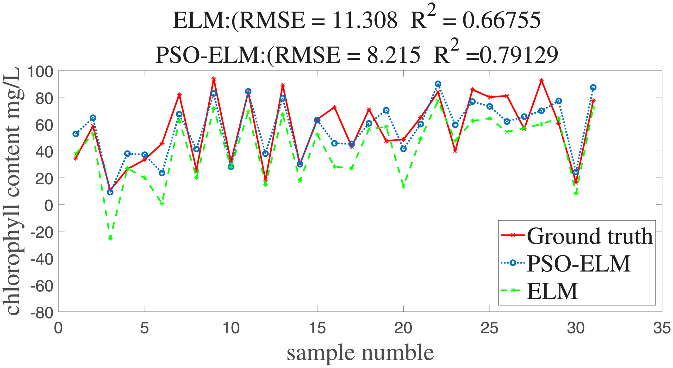 通過正交陣列獲得的一組參數(shù),我們可以得到PSO-ELM粳稻葉綠素含量反演模型。將新建立的反演模型應用于實驗數(shù)據(jù),得到R2 = 0.791,RMSE = 8.215 mg/L。結果遠優(yōu)于ELM模型,該模型的R2 = 0.667,RMSE = 11.308 mg/L。反演結果表明,PSO-ELM模型對葉綠素含量的預測效果明顯優(yōu)于傳統(tǒng)ELM模型(圖2)。