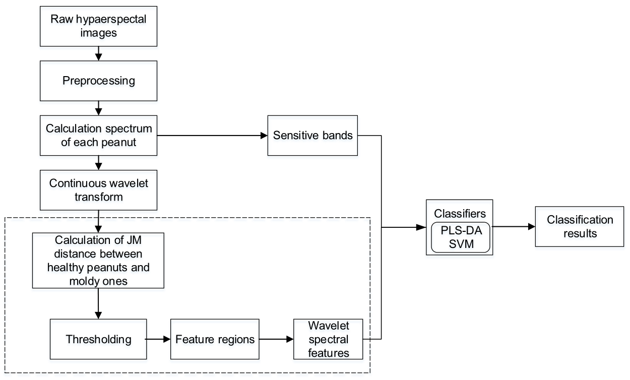 因此,在本研究中,我們將CWT與傳統(tǒng)的光譜特征提取方法進行比較,以確定其在霉變花生鑒定中的性能。本研究的重點是提取敏感小波特征(Wavelet feature, WF),并對其在花生霉變鑒定中的魯棒性進行了測試。研究目標是:(1)了解霉變花生的光譜特征;(2)確定適合鑒定霉變花生的CWT;(3)通過比較WF與SPA(Successive projection algorithm)選擇的最佳波段來檢驗CWT在霉變花生鑒定中的性能。