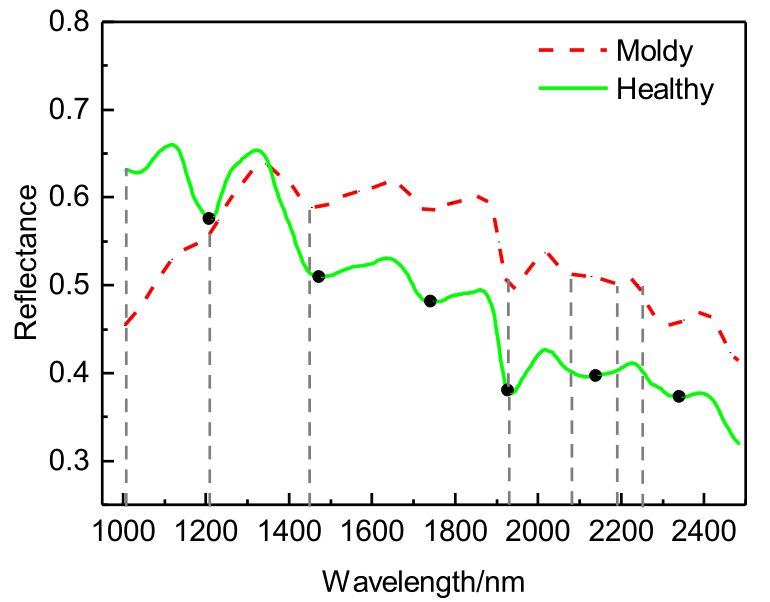 圖3 健康花生和霉變花生的光譜響應(yīng)。黑點表示健康花生的吸收峰,垂直虛線表示SPA選擇的最佳波長。