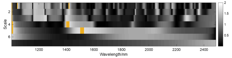 在本研究中,由于吸收特征的形狀與標準高斯函數(shù)相似,因此選擇墨西哥帽作為母小波基。為了減少計算量,我們只在尺度21、22、23、…、27下取小波冪。