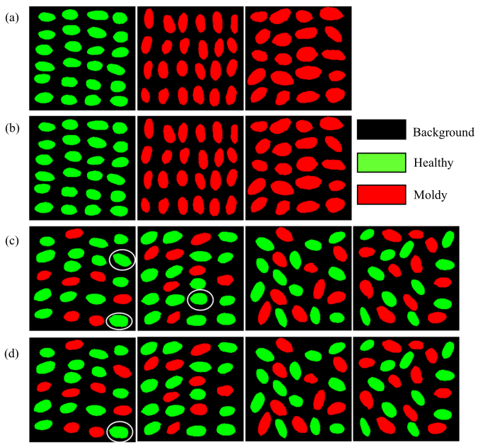 圖5 SVM對訓練集使用最優(yōu)波段(a)和WF(b)進行籽粒尺度分類,對測試集使用最優(yōu)波段(c)和WF(d)進行籽粒尺度分類