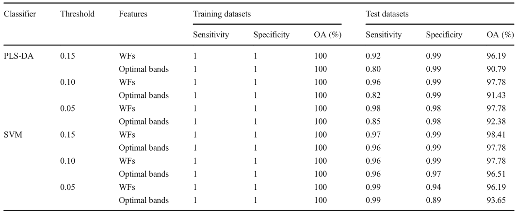 本研究使用SPA選擇最佳波段與WFs的分類結(jié)果進行比較。使用的分類模型為偏最小二乘判別分析(PLS-DA)和支持向量機(SVM)。評價指標為靈敏度、特異度和準確率。
