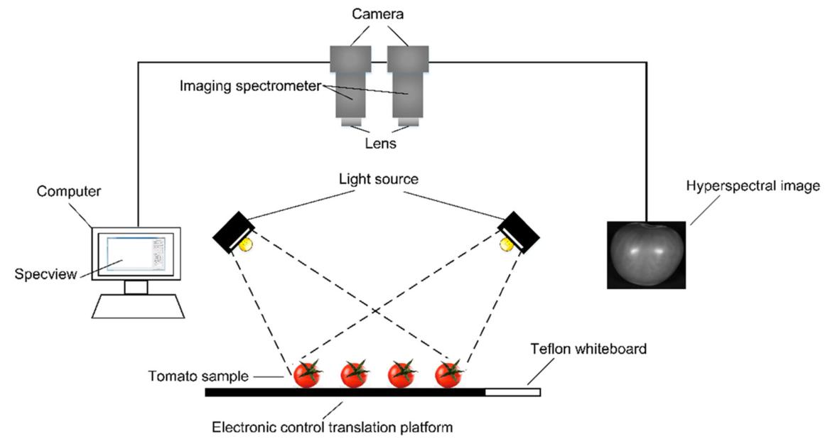 番茄成熟度是描述番茄生長(zhǎng)狀態(tài)和品質(zhì)的重要指標(biāo)。成熟期中等的番茄保質(zhì)期較長(zhǎng),適合保存,具有較高的商業(yè)價(jià)值。因此,準(zhǔn)確區(qū)分中間成熟度有助于小農(nóng)和小型食品加工企業(yè)進(jìn)行收獲和儲(chǔ)存決策。高光譜成像技術(shù)作為一種高效、無(wú)損的技術(shù),將傳統(tǒng)光譜分析與機(jī)器視覺有機(jī)結(jié)合,在水果成熟度檢測(cè)中得到了廣泛應(yīng)用。高光譜圖像包含數(shù)百個(gè)連續(xù)波段的大量數(shù)據(jù),可以提供豐富的番茄成熟度相關(guān)信息。因此本研究利用高光譜成像技術(shù)對(duì)番茄成熟度進(jìn)行區(qū)分。