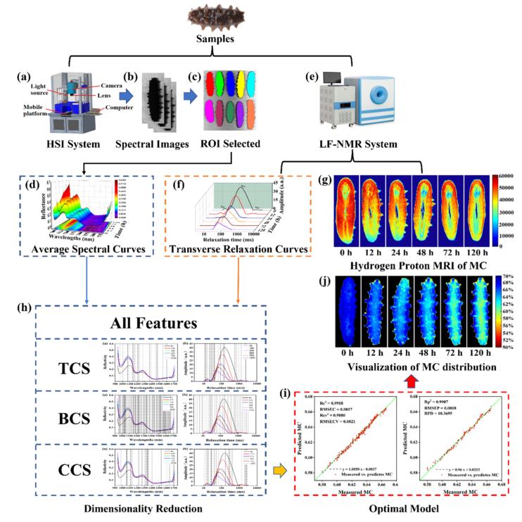 大量研究使用高光譜成像(Hyperspectral imaging, HSI)和低場核磁共振(Low field nuclear magnetic resonance, LF-NMR)研究水的遷移和變化并預(yù)測MC。HSI是一種用于探測淺水表面物理和化學(xué)性質(zhì)的快速、無損監(jiān)測技術(shù)。LF-NMR是另一種流行的無創(chuàng)檢測技術(shù),用于監(jiān)測食品中水分狀態(tài)的變化和水分遷移。低頻核磁共振之所以有效,是因為當(dāng)電磁脈沖(Electromagnetic pulse, EMP)在垂直方向輻射時,氫質(zhì)子由于能量從低能級到高能級的轉(zhuǎn)變而處于不穩(wěn)定狀態(tài),而當(dāng)EMP消失時,這一過程是可逆的。對于海參淺層表面復(fù)雜的棘皮結(jié)構(gòu)和內(nèi)部復(fù)雜的腔體、體壁等結(jié)構(gòu),HSI和LF-NMR聯(lián)合檢測可以更準(zhǔn)確地預(yù)測MC。
