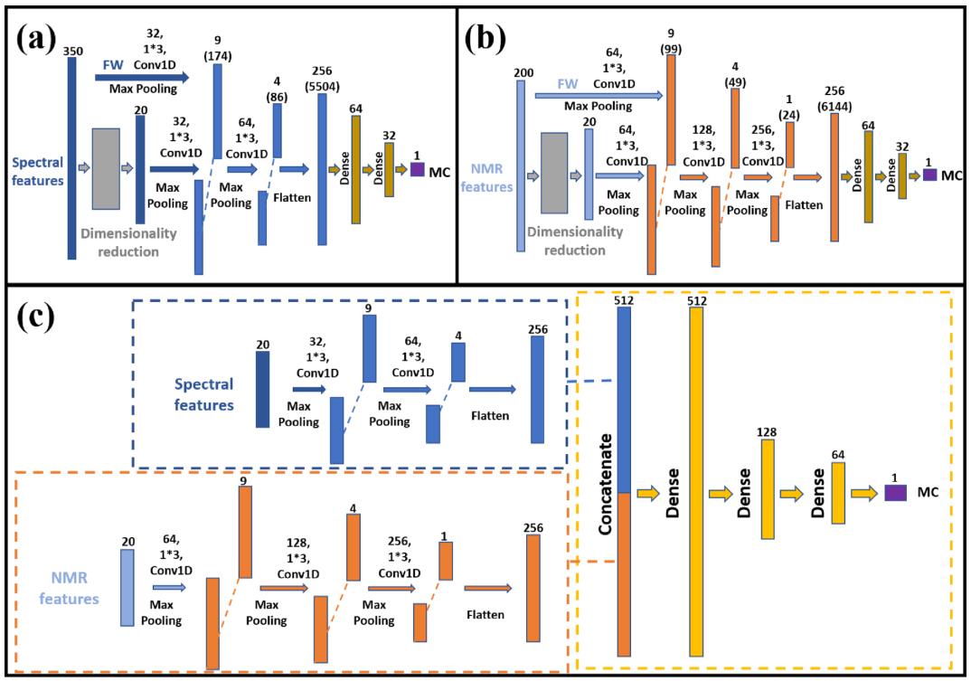 圖2 多種深度學(xué)習(xí)模型?;诠庾V的深度學(xué)習(xí)模型(a);基于LF-NMR的深度學(xué)習(xí)模型(b);融合深度學(xué)習(xí)模型(c)。