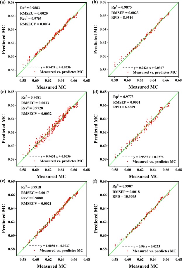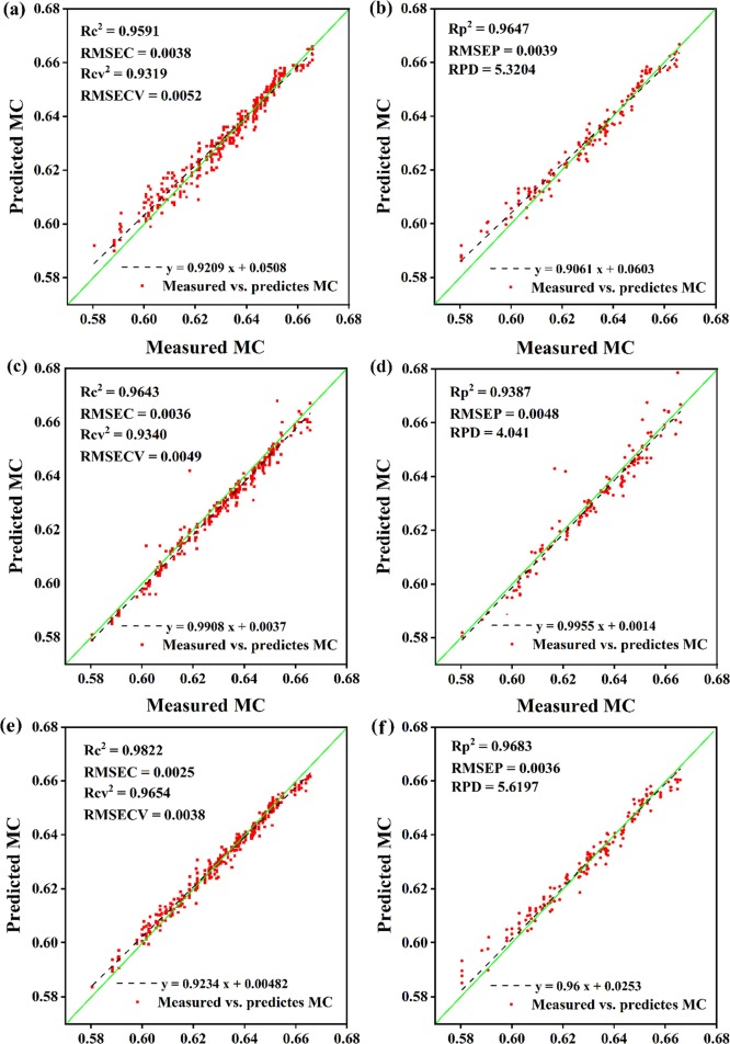 圖5 HSI-W-DL模型在校準(zhǔn)集(a)和預(yù)測集(b)、LF-NMR-WDL模型在校準(zhǔn)集(c)和預(yù)測集(d)、W-FDL模型在校準(zhǔn)集(e)和預(yù)測集(f)的模型精度。