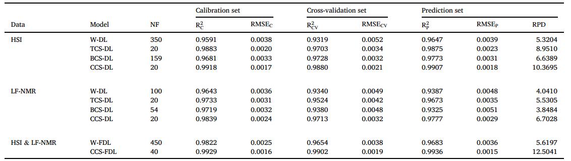 圖10 在HSI和LF-NMR數(shù)據(jù)集中使用CCS提取特征的FDL模型的預(yù)測結(jié)果