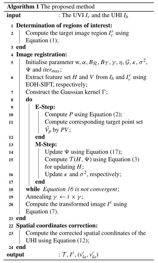 其次,在獲取參考值后,利用UVR對UHI進(jìn)行圖像配準(zhǔn)。圖像配準(zhǔn)的目的是對高光譜影像進(jìn)行變換,使其與目標(biāo)影像UVR對齊。將UHI在更精確的地理坐標(biāo)上對齊,以實(shí)現(xiàn)樹種的定位。主要分為以下三步:(1)特征點(diǎn)提取。在基于特征的方法中,特征提取是點(diǎn)集配準(zhǔn)的關(guān)鍵。本研究采用基于SIFT-like scale space(EOH-SIFT)的Edge Oriented Histogram descriptor(EOH)進(jìn)行特征點(diǎn)集提??;(2)特征點(diǎn)集配準(zhǔn)。采用期望*大化(Expectation maximization, EM)算法來完成圖像配準(zhǔn)過程,該過程在兩步之間交替進(jìn)行。EM算法的這兩步分別對應(yīng)于對應(yīng)估計(jì)和變換更新;(3)圖像變換。為了解決圖像的幾何畸變和非剛性畸變,我們利用薄板樣條插值(Thin plate spline, TPS)來模擬更廣泛的變換。