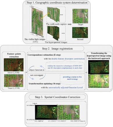 首先,利用高分辨率的UVI和地面控制點(diǎn)來拼接一個(gè)地理坐標(biāo)系作為參考值,并根據(jù)拼接后的UVI中的高光譜圖像選擇合適的區(qū)域(UVR)。