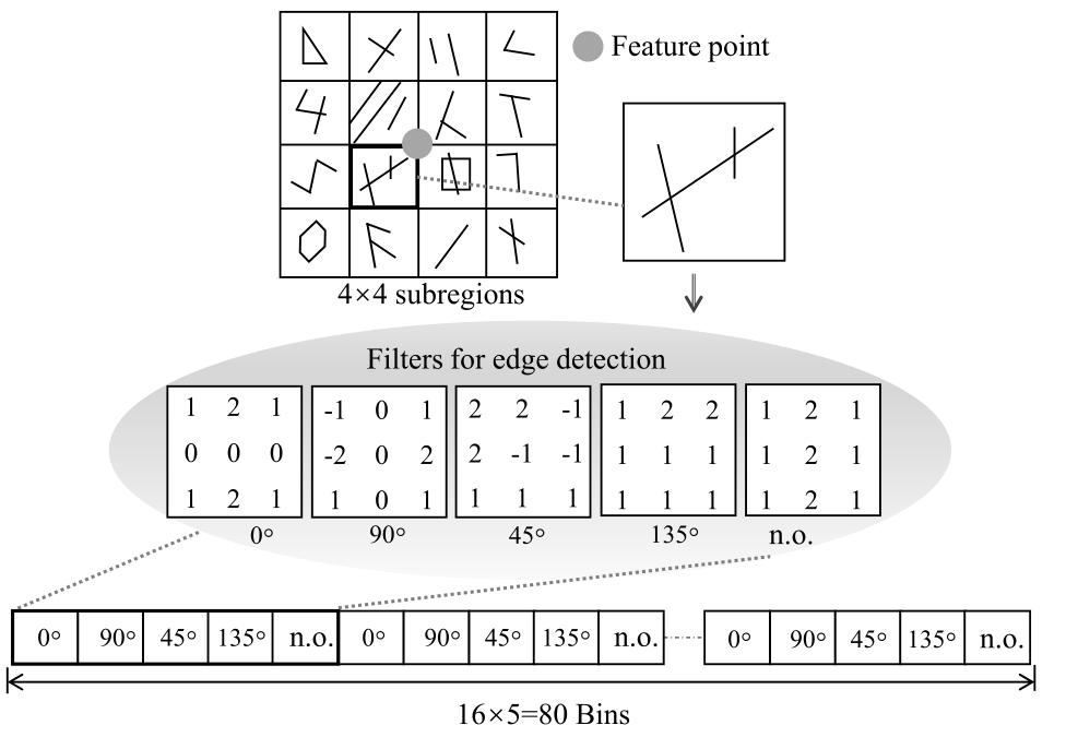 文中使用的EOH-SIFT算法是一種特征點(diǎn)描述符,用于在同一場景的RGB圖像上匹配特征集。首先,通過類似SIFT的尺度空間表示法檢測特征集,然后用EOH來表示這些特征集,得到80維的向量作為EOH-SIFT描述符,如圖2所示。