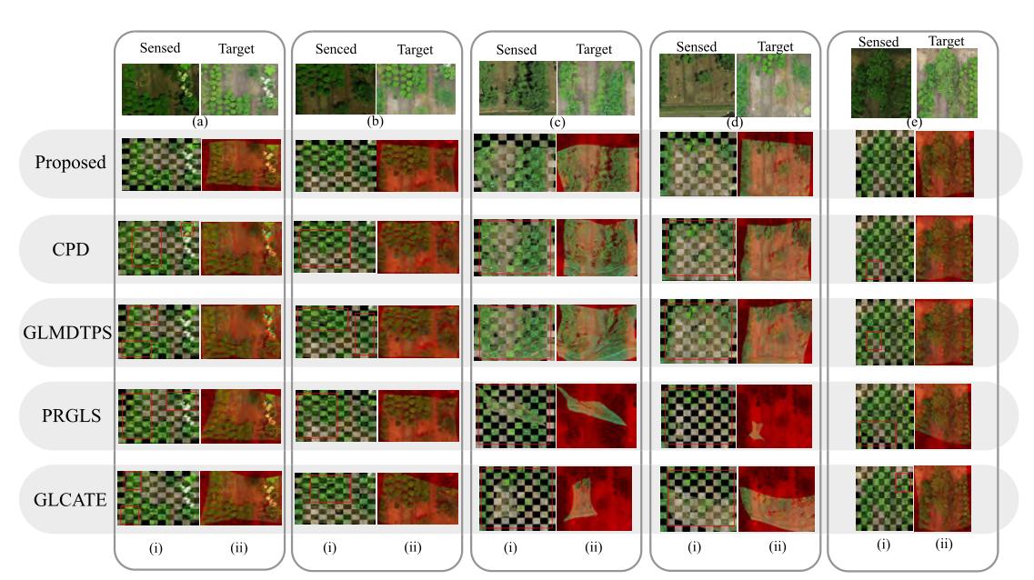圖3 不同配準(zhǔn)方法示例。(i)為每個(gè)示例的10 × 10校準(zhǔn)板,其中使用紅色矩形突出顯示配準(zhǔn)錯(cuò)誤;(ii)為重疊面積