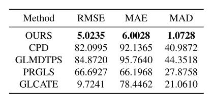 為了驗(yàn)證所提出的配準(zhǔn)方法的優(yōu)越性,將本研究的方法與相干點(diǎn)漂移(CPD)、用薄板樣條變換的全局和局部混合距離(GLMDTPS)、全局-局部對應(yīng)和變換估計(jì)(GLCATE)以及保存全局和局部結(jié)構(gòu)(PRGLS)這四種方法進(jìn)行比較。