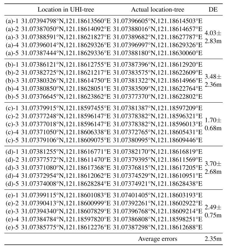 表3 單棵樹在UHI中的坐標(biāo)與實(shí)際坐標(biāo)的比較結(jié)果。DE表示偏離誤差