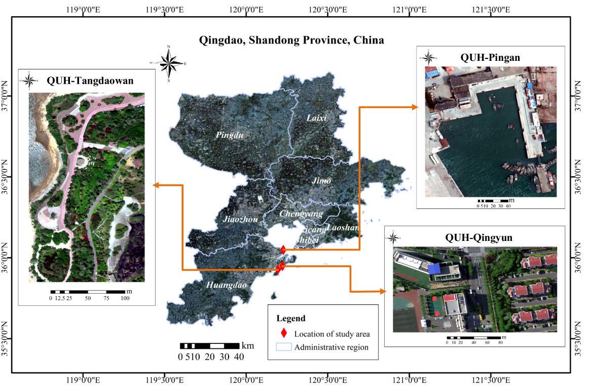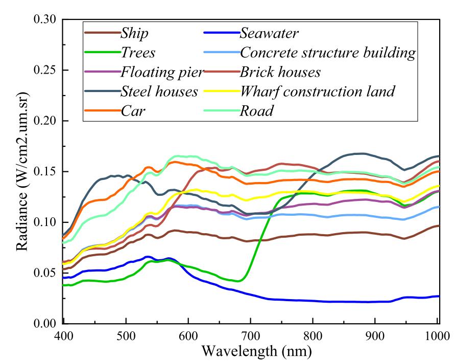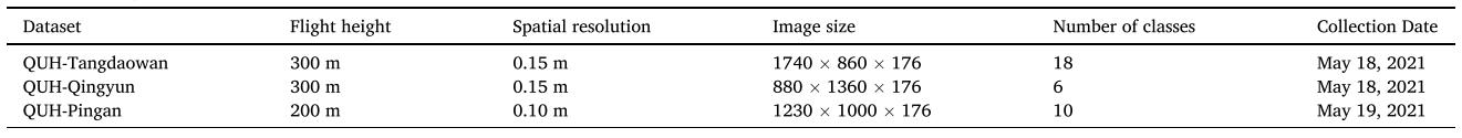 中國(guó)石油大學(xué)孫根云教授團(tuán)隊(duì)選取了位于中國(guó)山東省青島市西海岸新區(qū)的三個(gè)研究區(qū)(圖1)。在此研究中構(gòu)建了具有高分類挑戰(zhàn)的QUH數(shù)據(jù)集。QUH數(shù)據(jù)集包含三個(gè)子數(shù)據(jù)集,即QUH-唐島灣、QUH-青云和QUH-平安,均由安裝在無(wú)人機(jī)平臺(tái)上的高光譜傳感器Gaiasky mini2-VN成像光譜儀(江蘇雙利合譜科技有限公司)獲取,規(guī)格如圖2所示。三個(gè)數(shù)據(jù)集的詳細(xì)飛行參數(shù)信息如表1所示。QUH-唐島灣、QUH-青云、QUH-平安數(shù)據(jù)集詳細(xì)的土地覆蓋分布及相應(yīng)的光譜曲線分別如圖3和圖4、圖5和圖6、圖8和圖9所示。然而,QUH-青云數(shù)據(jù)集的某些區(qū)域被建筑物陰影遮擋,包括樹(shù)木、汽車和瀝青道路等類別(圖7)。
