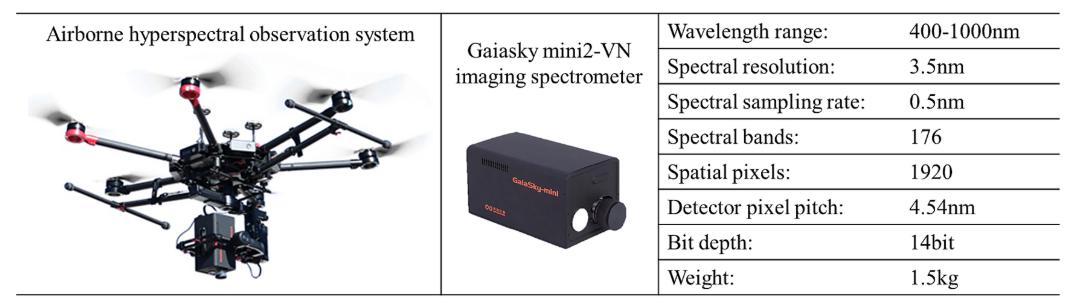 圖2:無(wú)人機(jī)機(jī)載高光譜觀測(cè)系統(tǒng)及Gaiasky mini2-VN成像光譜儀參數(shù)