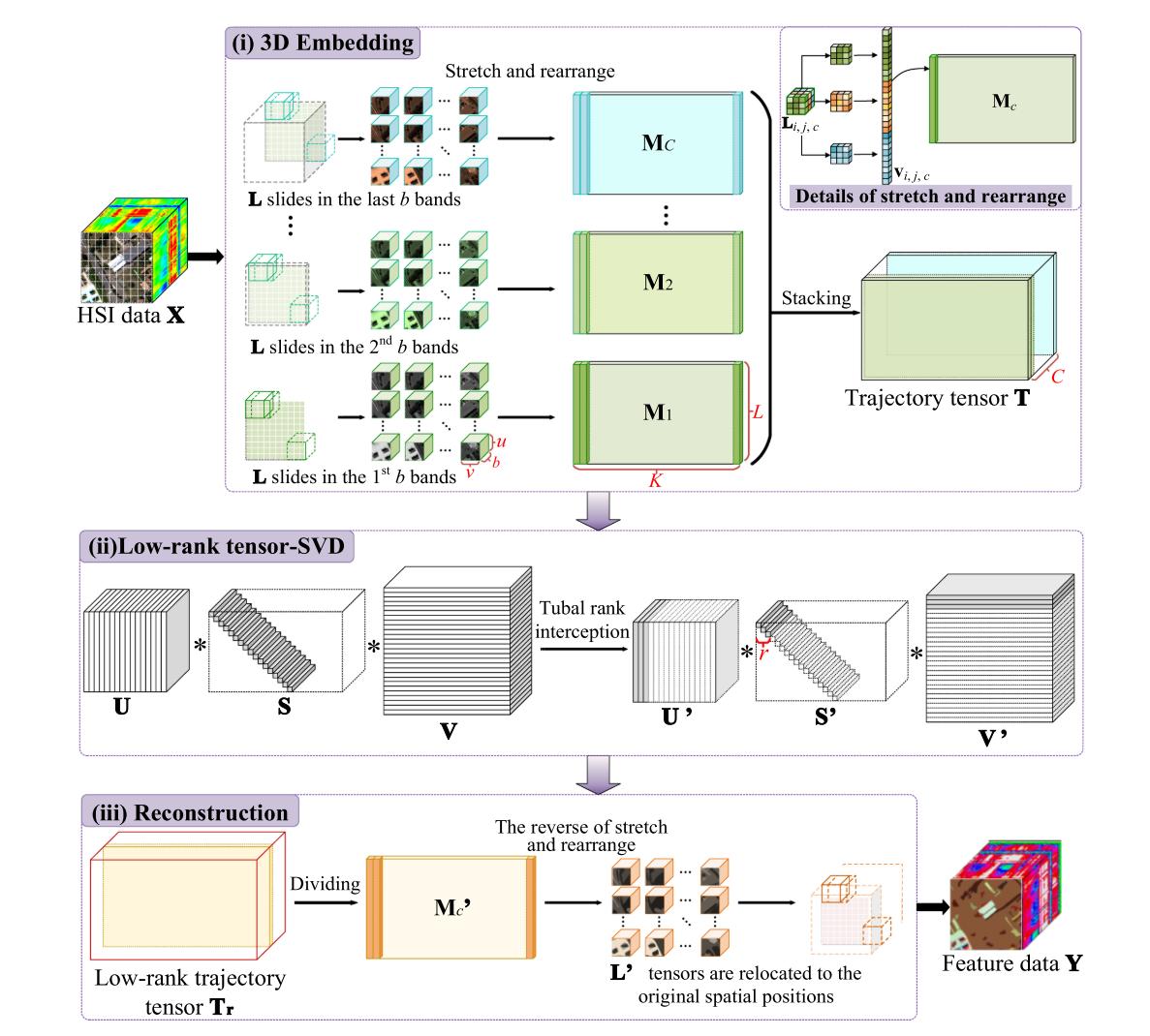 所提出的 3DSSA 使用局部 3D 窗口對(duì)整個(gè) HSI 的全局低秩張量進(jìn)行建模,探索光譜和空間依賴性并提取 3D 上下文特征。它由三個(gè)主要步驟組成:(1)3D 嵌入,(2)低秩張量 SVD,(3)重建。