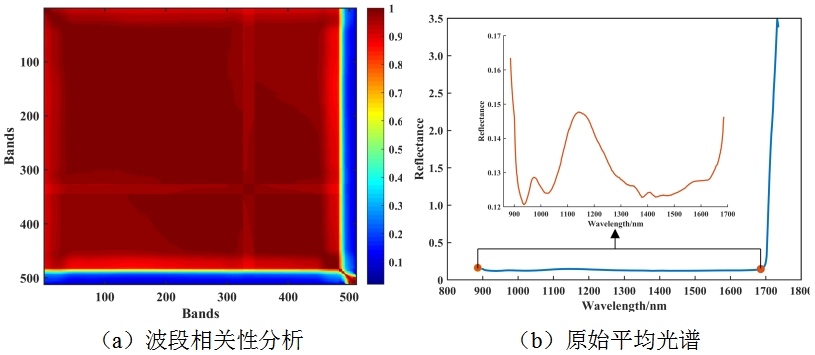 圖1b(藍(lán)色線條)為HSI捕獲到的原始平均光譜曲線,可以明顯看到在整個(gè)光譜區(qū)域沒(méi)有特異的波峰波谷。為了找出峰谷突出的區(qū)域,分析了光譜波段之間的相關(guān)性。對(duì)于維度為(x, y, λ)的高光譜數(shù)據(jù),轉(zhuǎn)換為(z = x × y, λ),并對(duì)z進(jìn)行相關(guān)性分析,結(jié)果如a所示。圖中顯示紅色區(qū)域的波段在整個(gè)波段中占比94.34%,其余顏色區(qū)域總共占比5.66%。為了***限度地保留 “純凈數(shù)據(jù)”,防止其它顏色區(qū)域數(shù)據(jù)的干擾,通過(guò)查詢顏色欄數(shù)據(jù)并結(jié)合波段得知紅色與其余顏色區(qū)域的相關(guān)性分界點(diǎn)為0.8(波段:483)。隨后,將相關(guān)性小于0.8的30個(gè)波段從數(shù)據(jù)分析中剔除,從而***了1685.47-1735.34 nm的光譜區(qū)域。得到的光譜曲線如圖1b(紅線)所示。該過(guò)程獲得的光譜數(shù)據(jù)(150×483)用于后續(xù)的模型建立和分析。
