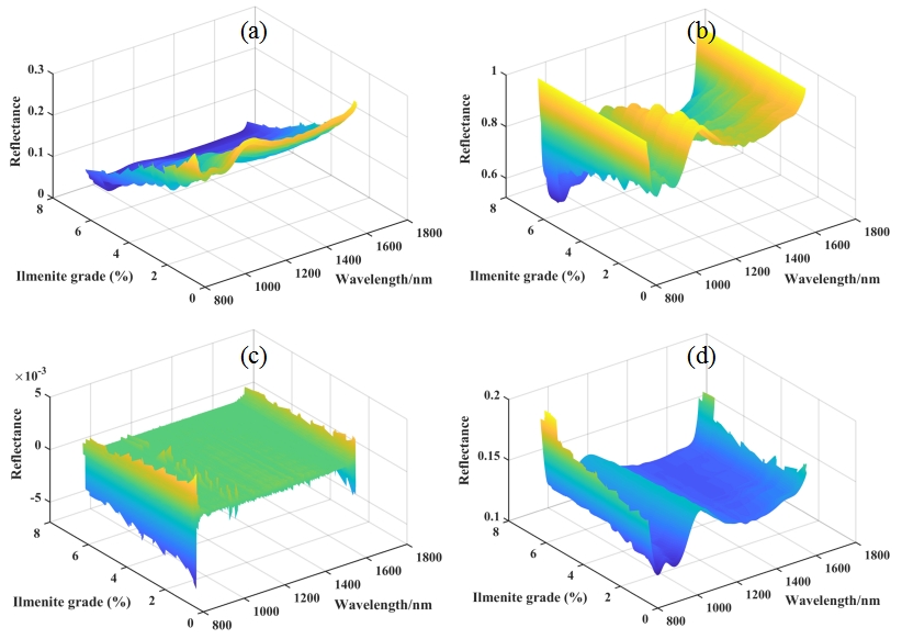 鈦鐵礦樣本的光譜反射率值在0.03 - 0.27之間,證實(shí)粉狀鈦鐵礦的整體反射率較低,并隨品位的增加而降低。圖1b顯示在NIR區(qū)域,該鈦鐵礦的光譜特征分別在940nm、1020nm和1300~1650nm處出現(xiàn)了波谷。具體地,光譜反射率值在940 nm處達(dá)到谷值,隨后急劇下降,這主要?dú)w因于O-Ti-O的拉伸和變形。該鈦鐵礦較寬的吸收波段主要位于1300 ~ 1650 nm,Izawa指出這是由八面體配位的亞鐵在此附近產(chǎn)生晶體場(chǎng)躍遷分裂而引起的。