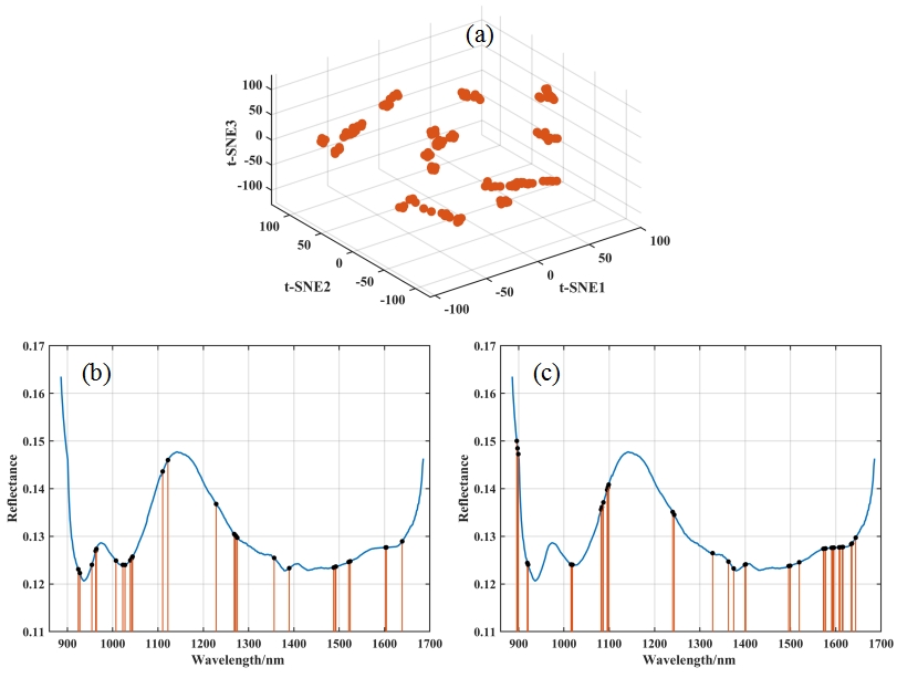 圖3 不同降維方法下的數(shù)據(jù)分布:(a) t-SNE;(b) iPLS-VCPA-IRIV;(c) iPLS-VIP-IRIV。