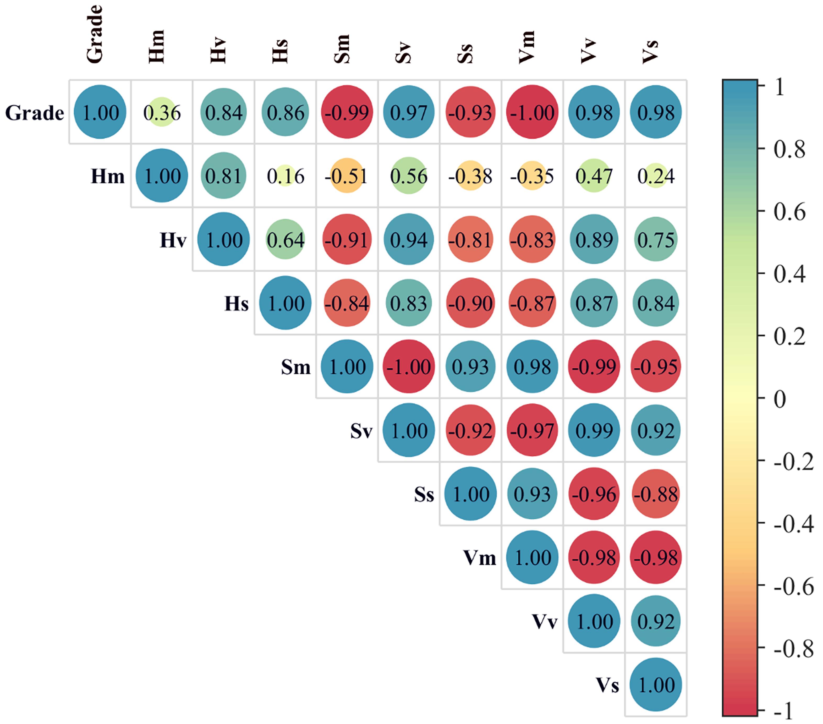 圖4 品位和顏色特征參數(shù)的皮爾遜相關(guān)性分析