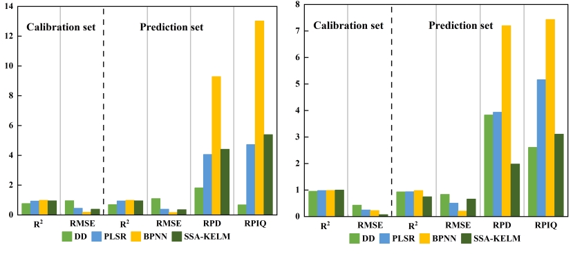 采用SG、MSC、CR、SD、MSC+SG等5種預(yù)處理方法對(duì)原始光譜數(shù)據(jù)進(jìn)行處理?;贒D模型對(duì)比原始光譜數(shù)據(jù),探索出HSI光譜數(shù)據(jù)的***預(yù)處理方法,結(jié)果如表2所示。預(yù)測(cè)集中,與原始數(shù)據(jù)相比,MSC+SG方法下的各指標(biāo)R2P提高了5.88%,RMSEP降低了34.39%,RPD和RPIQ分別提高了28.86%和38.93%。