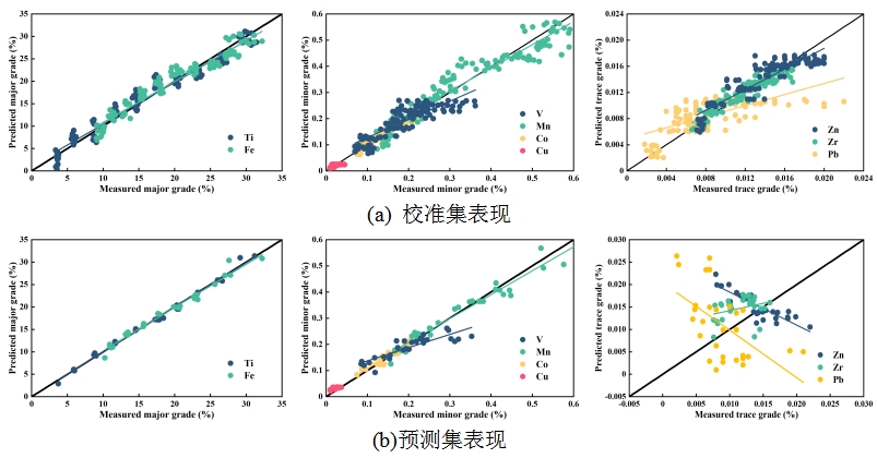 從iPLS-VCPA-IRIV特征選擇的擬合光譜數(shù)據(jù)圖(圖6)可以看出,在校正集中,鈦鐵礦多組分品位都均勻準(zhǔn)確地分布在理想曲線上。然而,對(duì)于預(yù)測(cè)集來(lái)說(shuō),明顯可以看出來(lái)的是,除擬合良好的主要品位(Ti、Fe)和次要品位(V、Mn、Co、Cu)外,微量品位(Zn、Zr、Pb)的擬合似乎并不令人滿意。因此,在下一步工作中,可以對(duì)少樣本量下礦石內(nèi)部微量品位的變化進(jìn)行更深入的研究。