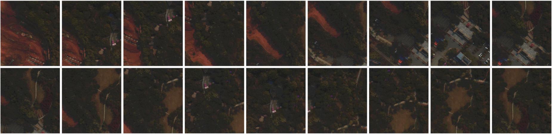 本文所進(jìn)行實(shí)驗(yàn)的數(shù)據(jù)集為無(wú)人機(jī)拍攝的真實(shí)高光譜數(shù)據(jù),拍攝場(chǎng)景為四川省某植物園,拍攝高度為300米,相鄰圖像具有較大的重疊區(qū)域,單張圖像空間分辨率為960×1057,光譜范圍覆蓋400-1100nm,每隔4nm獲取一幅單波段灰度圖像,共176個(gè)波段。該數(shù)據(jù)集包含有豐富的地物信息,包括樹(shù)林、灌木叢、草地、道路、建筑物等,數(shù)據(jù)在拍攝過(guò)程中受到噪聲影響,且相鄰圖像間具有一定視差,因此在該數(shù)據(jù)集上所進(jìn)行的實(shí)驗(yàn)?zāi)芊从潮疚姆椒ㄔ谡鎸?shí)環(huán)境與應(yīng)用中的有效性。所有實(shí)驗(yàn)均在2.8GHZ英特爾酷睿i7-7700HQ的CPU和8GB內(nèi)存的電腦上測(cè)試,方法以Matlab代碼實(shí)現(xiàn)。數(shù)據(jù)集中18幅高光譜源圖像如圖1所示,為了便于觀察,所展示的圖像為數(shù)據(jù)集中第76波段(對(duì)應(yīng)波長(zhǎng)700nm)、第38波段(對(duì)應(yīng)波長(zhǎng)548nm)及第13波段(對(duì)應(yīng)波長(zhǎng)448nm)三個(gè)波段所融合而成的偽彩色圖像形式。