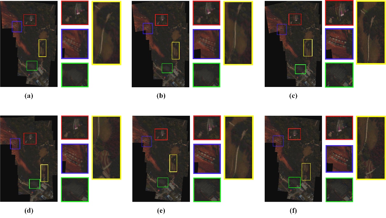 在拼接圖像空間視覺(jué)效果的驗(yàn)證實(shí)驗(yàn)中,將直接對(duì)數(shù)據(jù)集中18幅高光譜圖像拼接而成的全景圖像進(jìn)行性能驗(yàn)證,實(shí)驗(yàn)中將與現(xiàn)有的5個(gè)先進(jìn)拼接算法進(jìn)行對(duì)比,分別為ANAP、SPHP、DHW、NISwGSP與REW。不同拼接算法對(duì)18幅高光譜源圖像進(jìn)行拼接所得到的全景圖像拼接結(jié)果如圖2所示,總體來(lái)看,所有拼接算法均成功將18幅源圖像配準(zhǔn)至統(tǒng)一坐標(biāo)系下,得到了一幅完整的全景拼接圖像。為了對(duì)拼接圖像的細(xì)節(jié)效果進(jìn)行評(píng)估,將全景圖像中四處典型地物局部區(qū)域進(jìn)行放大,展示在對(duì)應(yīng)全景圖像右邊的紅、藍(lán)、黃、綠色矩陣方框中。從圖中可以看出,ANAP與SPHP算法拼接結(jié)果中的放大區(qū)域中均存在不同程度的模糊與重影,尤其是在藍(lán)色局部矩形區(qū)域中的白色正方形地物具有明顯的人工拼接痕跡。NISwGSP算法所得到的拼接結(jié)果在具有視覺(jué)重影的同時(shí),其黃色與藍(lán)色矩形區(qū)域局部矩形區(qū)域中出現(xiàn)了明顯的條紋狀幾何錯(cuò)位。相對(duì)于上述結(jié)果,雖然DHW算法所得到的全景圖像更加清晰平滑,但紅色和黃色的局部矩形區(qū)域的地物仍然存在明顯的顏色失真痕跡。由于REW算法與本文配準(zhǔn)方法具有相同的策略,即將圖像局部單應(yīng)變換與全局相似進(jìn)行結(jié)合,因此在圖2(e)與圖2(f)中,所得到的全景拼接圖像具有大體上幾乎一致的幾何形狀,然而通過(guò)觀察局部放大區(qū)域可以發(fā)現(xiàn),REW算法的紅色與黃色矩形區(qū)域內(nèi),典型地物仍具有明顯重影,而本章所提出方法的局部放大圖像中,所有地物均呈現(xiàn)出清晰的形貌特征,無(wú)任何明顯的人工拼接痕跡。因此,通過(guò)圖2中所展示的結(jié)果可以得出,本章提出方法所得到的全景拼接圖像具有更加清晰平滑的視覺(jué)效果,所有地物均呈現(xiàn)出清晰的形貌特征。此外,通過(guò)對(duì)相同局部放大區(qū)域的視覺(jué)效果進(jìn)行對(duì)比可以看出,本章方法的拼接圖像克服了對(duì)比算法結(jié)果中的所有缺陷,局部區(qū)域無(wú)任何明顯的人工拼接痕跡,具有更加良好的視覺(jué)效果。