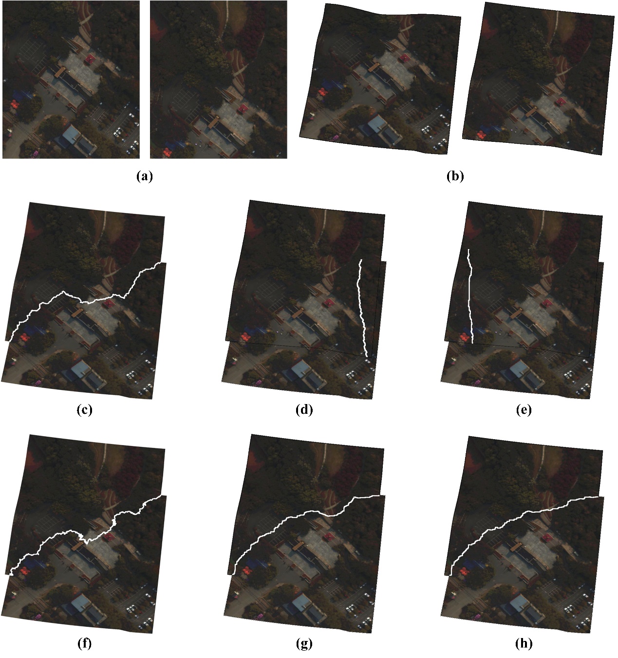 圖3 本文提出方法與其它拼縫線檢測(cè)方法的拼縫線質(zhì)量比較。利用SSIM指數(shù)對(duì)所有探測(cè)到的拼縫線進(jìn)行了定量對(duì)比。為了便于觀察,圖像同樣以偽彩色形式展示。(a)輸入兩幅高光譜源圖像;(b)配準(zhǔn)圖像;(c)Seam-driven,SSIM = 0.9098;(d)DP,SSIM = 0.8887;(e)EDP,SSIM = 0.8717;(f)Farse,SSIM = 0.9195;(g)5/2 normed,SSIM = 0.9203;(h)本章方法,SSIM = 0.9371。