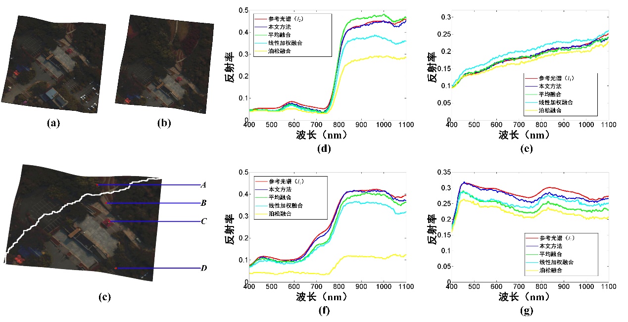 圖4 本文方法與三個(gè)傳統(tǒng)融合方法的光譜信息一致性對(duì)比結(jié)果。(a)、(b)兩幅已配準(zhǔn)的源圖像;(c)配準(zhǔn)圖像重疊區(qū)域及所得到的拼縫線,點(diǎn)“A”、“B”、“C”、“D”分別為圖中四個(gè)典型地物“樹(shù)木”、“道路”、“建筑物”以及“白色轎車(chē)”所對(duì)應(yīng)的像素;(d)“樹(shù)木”光譜曲線結(jié)果;(e)“道路”光譜曲線結(jié)果;(f)“建筑物”光譜曲線結(jié)果;(g)“白色轎車(chē)”光譜曲線結(jié)果。