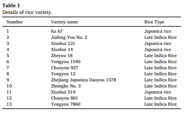 本研究以2021年收獲的13個晚稻品種為實驗材料,其中包括4個粳稻品種和9個晚秈稻品種,具體信息如表1所示。所有晚稻樣品均由浙江省糧庫提供。每個品種的晚稻樣品均采用自封袋密封包裝,并儲存于恒溫恒濕環(huán)境中(溫度10℃,濕度50%)。