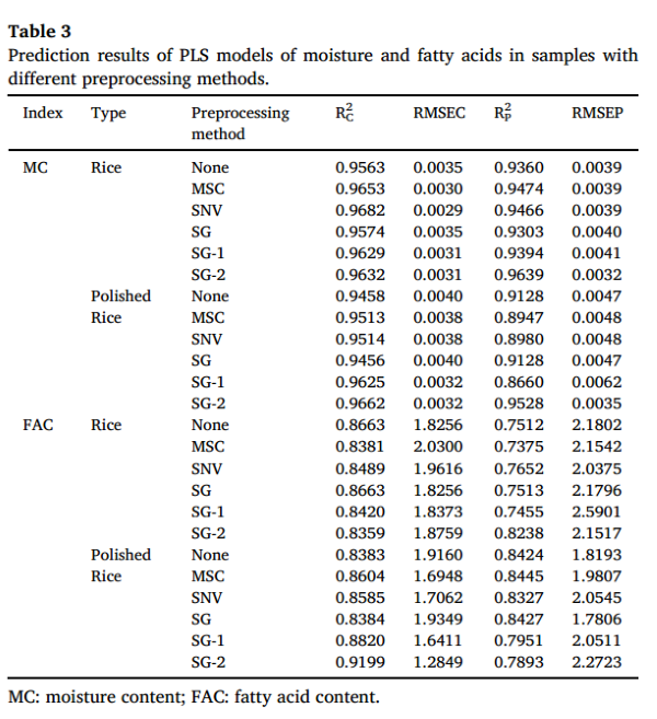 五種預處理方法被用于處理大米和精米樣品的光譜,并且使用偏最小二乘回歸(PLSR)算法建立了MC和FAC的校準模型。表3顯示了不同預處理方法下MC和FAC樣品PLS模型的預測結(jié)果。從表3中可以發(fā)現(xiàn),在“大米水分”模型中,使用SNV和SG-2預處理得到的結(jié)果是較好的。使用SNV預處理建立的模型的決定系數(shù)(R²C)相對較高,達到了0.9682。然而,該模型不穩(wěn)定,穩(wěn)健性較差,預測相關系數(shù)(R²P)僅為0.9466。因此,SG-2預處理的模型比SNV預處理的模型表現(xiàn)更好。在“大米脂肪酸”模型中,除了SG-2外,其他預處理方法的R²P未達到0.8,且R²P與R²C差異顯著,因此這些模型的穩(wěn)健性較差。因此,SG-2是“大米脂肪酸”模型中最佳的預處理方法。對于“精米水分”,SG-2預處理的模型具有更高的R²C和R²P??傊琒G-2是在“大米水分”、“精米水分”和“大米脂肪酸”三個預測模型中最佳的預處理方法。這三個模型的R²P和均方根誤差(RMSEP)分別為0.9639、0.9528、0.8238和0.0032、0.0035、2.1517。而在“精米脂肪酸”模型中,SG平滑是最佳的預處理方法,該模型的R²P和RMSEP分別為0.8427和1.7806。