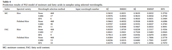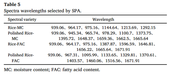 由于使用SG或SG-2預處理的MC和FAC模型獲得了最佳結(jié)果,因此對這些光譜進行了CARS和SPA方法處理,以選擇對水分和脂肪酸有顯著影響的波長。然后,使用這些選定的波長通過PLSR開發(fā)了水分和脂肪酸的校準模型,并比較了“大米水分、精米水分、大米脂肪酸和精米脂肪酸”四個模型的性能。從表4可以看出,CARS選擇的基本波長數(shù)量分別為17、40、17和13,而SPA選擇的基本波長數(shù)量分別為6、11、9和10。SPA選擇的重要波長數(shù)量更少,使得實際應用更為簡便。CARS模型的R²P分別為0.9643、0.9445、0.7528和0.8480。SPA模型的R²P分別為0.9650、0.9567、0.8436和0.8573。SPA模型具有更高的R²P,且模型更為精確。CARS模型的RPD值分別為5.3750、4.3784、2.0565和2.6227。SPA模型的RPD值分別為5.5484、4.9091、2.5854和2.7070。SPA模型的RPD值更高,表明模型更為穩(wěn)定。
