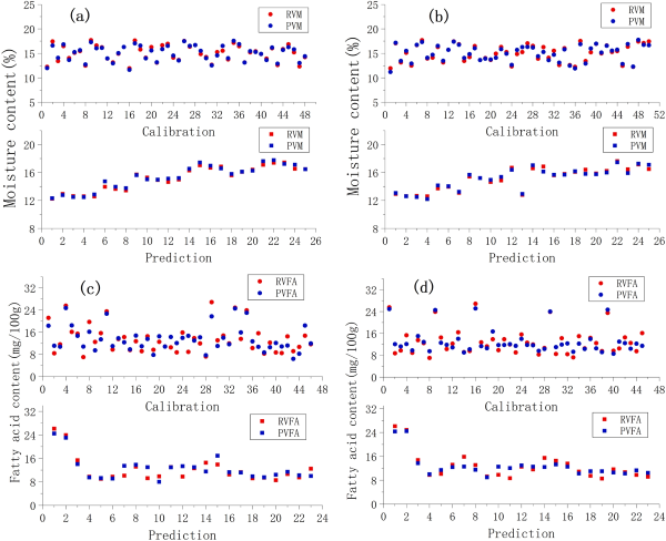 圖4. 大米/精米中水分和脂肪酸預測結(jié)果的散點圖:(a) 大米中的水分;(b) 精米中的水分;(c) 大米中的脂肪酸;(d) 精米中的脂肪酸。RVM:水分的實際值;PVM:水分的預測值;RVFA:脂肪酸的實際值;PVFA:脂肪酸的預測值。