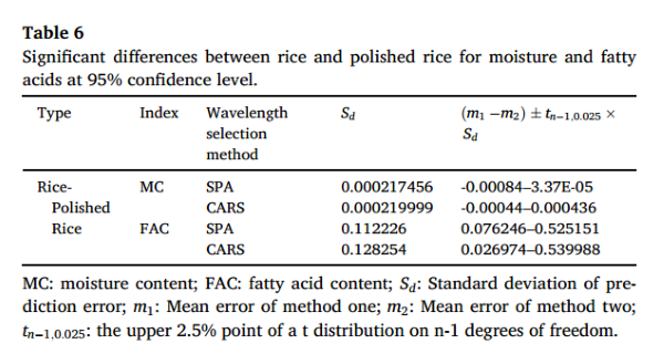 由于稻殼的高吸水能力,大米中MC模型的性能優(yōu)于精米,且大米光譜中包含了更多的水分信息。而大米中FAC模型的性能不如精米。因為稻殼不含有脂肪酸,而存在于大米光譜中的稻殼干擾信息可能會影響脂肪酸的預測。然而,在進行波長選擇后,大米和精米中MC或FAC的預測精度更為接近,看起來稻殼的影響消失了。因此,通過Fearn提出的方法驗證了稻殼對MC和FAC預測精度的影響。第一種方法是計算在95%置信水平下區(qū)間是否包含0。如果包含零,則偏差在5%水平上沒有顯著差異。從表6可以看出,計算出的大米和精米MC預測誤差的區(qū)間包含0,而FAC的區(qū)間不包含0。這表明大米和精米FAC預測誤差之間存在顯著差異,因此稻殼對FAC的預測精度有影響。