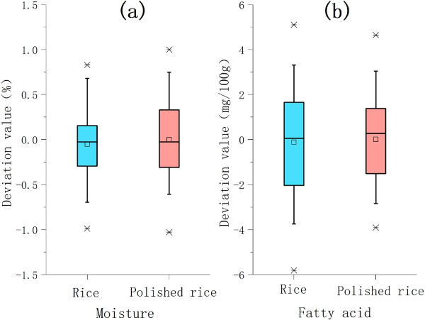 圖5. 大米和精米水分和脂肪酸預測偏差值的箱線圖:(a) 水分;(b) 脂肪酸。