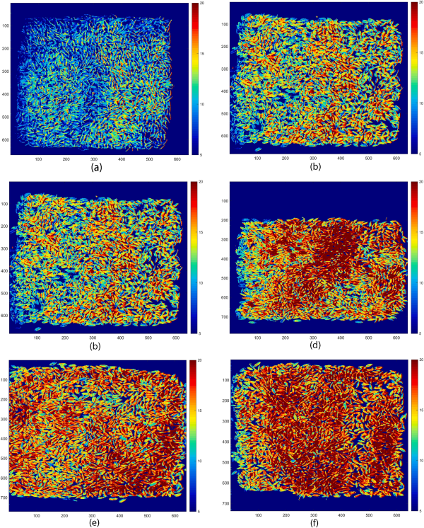 圖6. 大米水分含量的可視化圖。(a) 12-13克/100克水分含量 (b) 13-14克/100克水分含量 (c) 14-15克/100克水分含量 (d) 15-16克/100克水分含量 (e) 16-17克/100克水分含量 (f) 17-18克/100克水分含量。