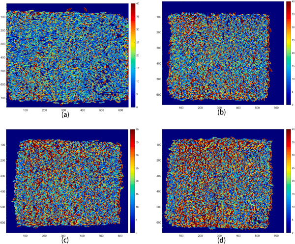 圖7. 大米脂肪酸含量的可視化圖。(a) 脂肪酸含量 = 8.42毫克/100克 (b) 脂肪酸含量 = 16.13毫克/100克 (c) 脂肪酸含量 = 23.91毫克/100克 (d) 脂肪酸含量 = 25.56毫克/100克。