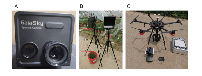 圖1.數(shù)據(jù)采集設(shè)備。A. GaiaSky mini2 VN相機 B. 地面數(shù)據(jù)采集設(shè)備C. 無人機(UAV)數(shù)據(jù)采集設(shè)備