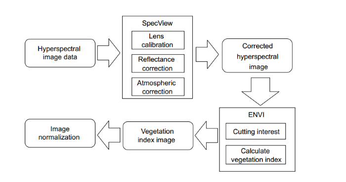 為確保數(shù)據(jù)質(zhì)量,首先對采集的高光譜圖像進行數(shù)據(jù)預(yù)處理(圖2),包括黑白板校正、鏡頭畸變校正和大氣校正,以消除光照變化、設(shè)備噪聲和環(huán)境因素的干擾。同時,利用歸一化植被指數(shù)(NDVI) 計算紅光(680 nm)和近紅外光(800 nm)反射率,提高植被像素與非植被像素的區(qū)分度。