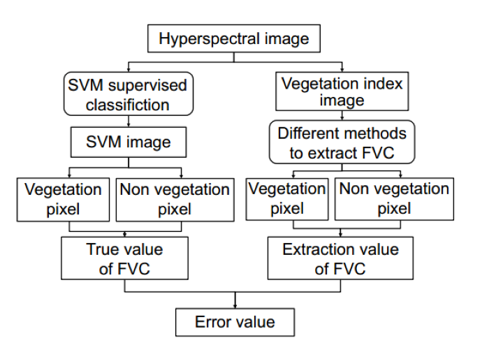 然后,分別采用像元二分法和DPK-means算法提取小麥的FVC,并基于支持向量機(SVM)監(jiān)督分類結(jié)果對比分析了兩種方法的提取效果,具體的提取過程如圖3所示。最終,通過誤差分析(EF、RMSE)、擬合度(R²)和誤差分布圖 對比不同方法的表現(xiàn),以驗證 DPK-means 在植被覆蓋度提取中的適用性和優(yōu)勢。
